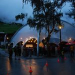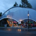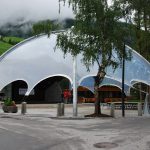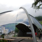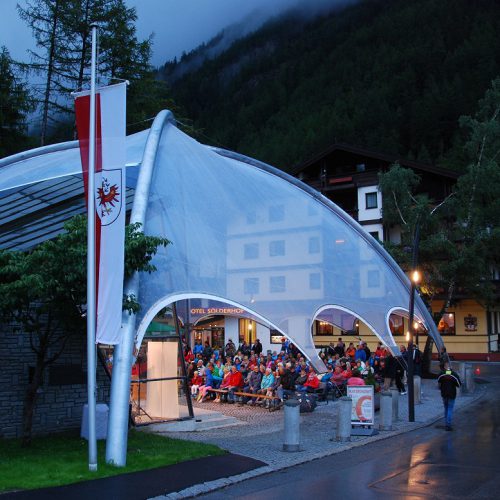 Vor die bestehende Bühne in Sölden sollte eine Platzüberdachung errichtet werden. Aufgrund akustischer Überlegungen und der stützenfreien Vorgabe sowie maximaler Transparenz, entstand eine einzigartige, zweiachsig gekrümmte ETFE Folienüberdachung. Diese macht es nun auch möglich Veranstaltungen bei Regenwetter abzuhalten.